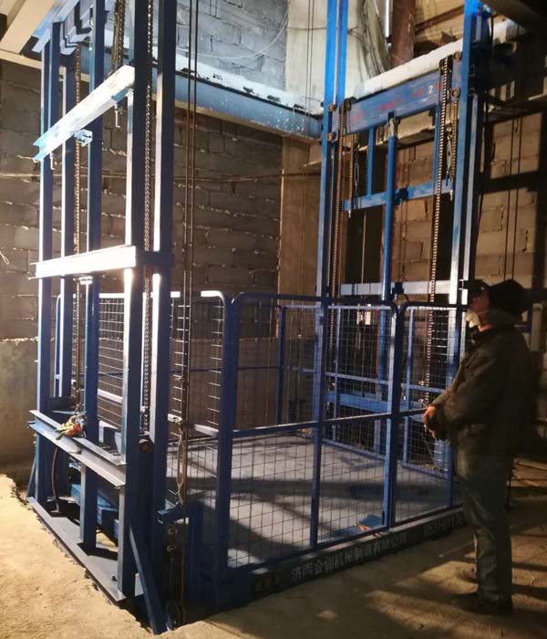 鏈條式液壓升降貨梯是用于貨物升降的升降機(jī)械設(shè)備,采用液壓油缸作為主要?jiǎng)恿,通過重型鏈條和鋼絲繩傳動(dòng),保證機(jī)器運(yùn)行的絕對(duì)安全。貨梯無需地坑和機(jī)房,特別適合于有地下室、倉庫改造、新建貨架等,具有安裝維修方便、美觀、安全、操作方便。具體根據(jù)現(xiàn)場(chǎng)的實(shí)際環(huán)境生產(chǎn)。