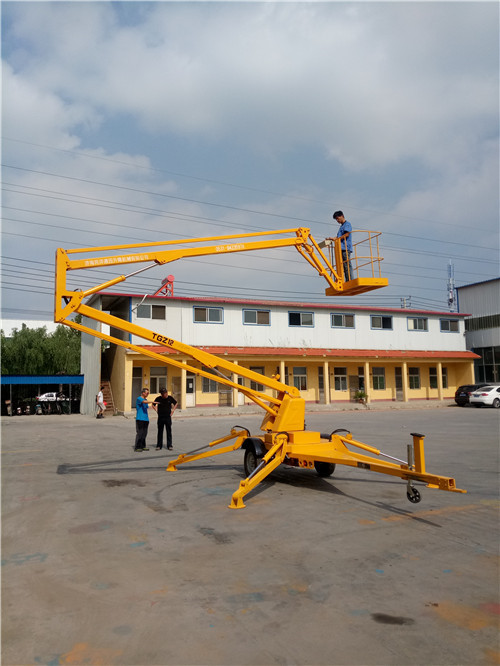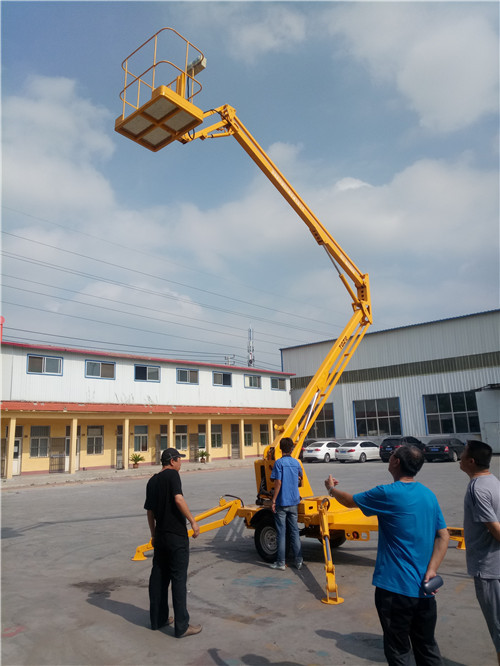 客戶來公司考察,拖車折臂式液壓升降機(jī),升高8-20米,載重260公斤,最大延伸工作距離2-8米